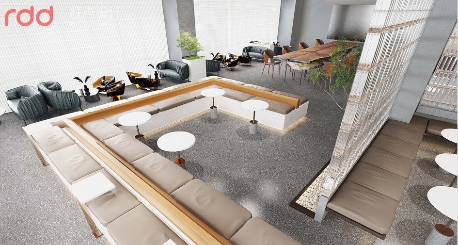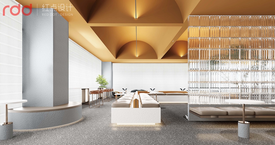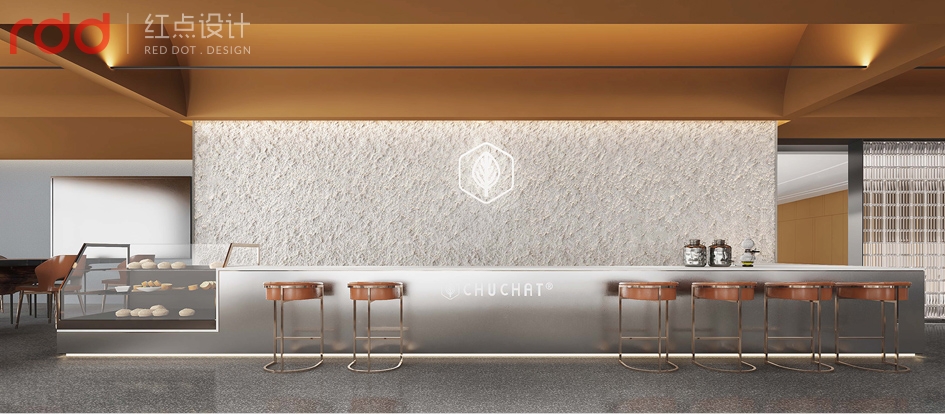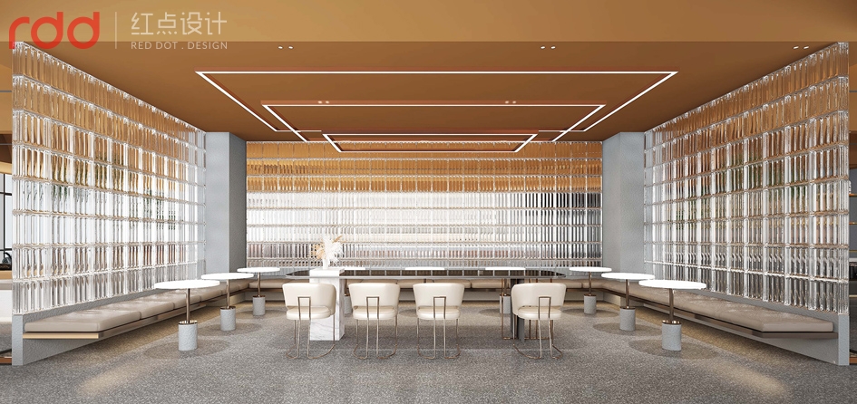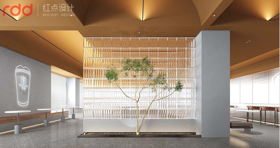進入公司放棄了傳統公司前臺理念,以水吧和洽談區為一體,背后的文化墻體現了初茶的LOGO,配合企業VI,以延續“初茶”品牌現代茶飲文化,打造體驗感展廳,初茶初衷,只做茶臻品。因此展廳吊頂大面積使用金色,讓整個空間透露出高貴,雅致且簡約潮流的氣息。展廳造獨立玻璃磚端景,令洽談區的獨立性,展廳的穿透性大氣又時尚,又能讓人聯想到人與自然的結合,天人合一的思想由然而已生。