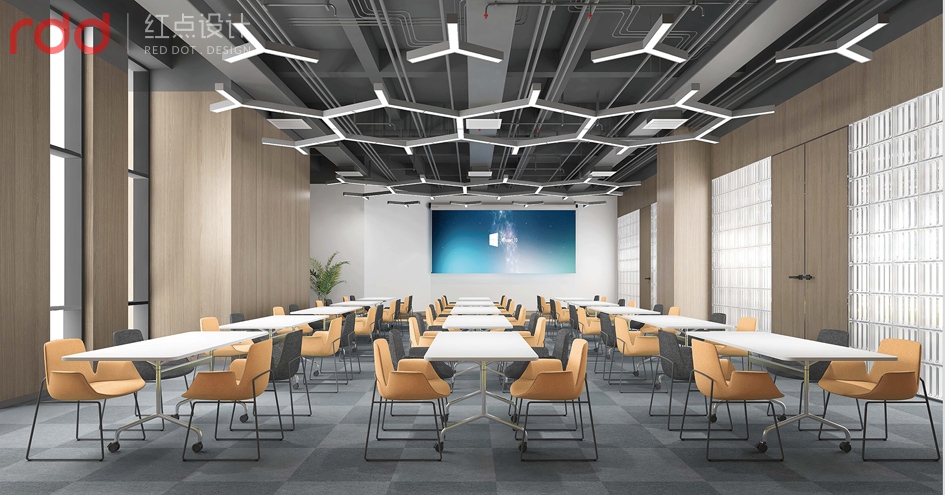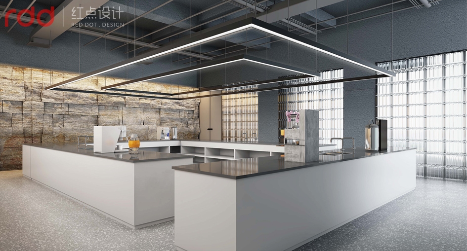 產品展示區設立多個擺放區極簡展品柜,在立面空間表現了設計定律,多則是少,少則是多的理念。產品的展臺,用以開放式展示,讓不同產品和原料的展示,產品讓客戶得以觀,觸,摸真實的體現。培訓區域設置在整個空間的右側,既能保持空間足夠容納眾多學員的培訓與實操,避免了影響到辦公和其它區域。