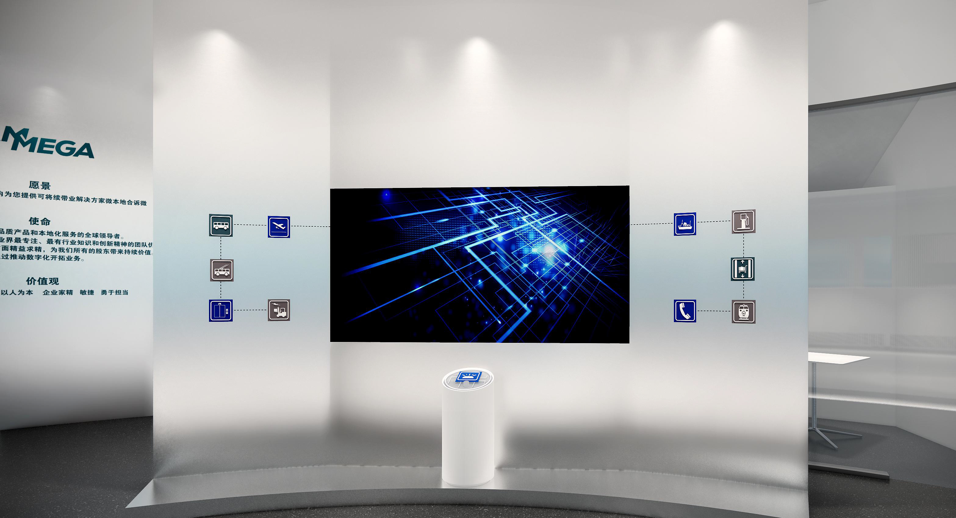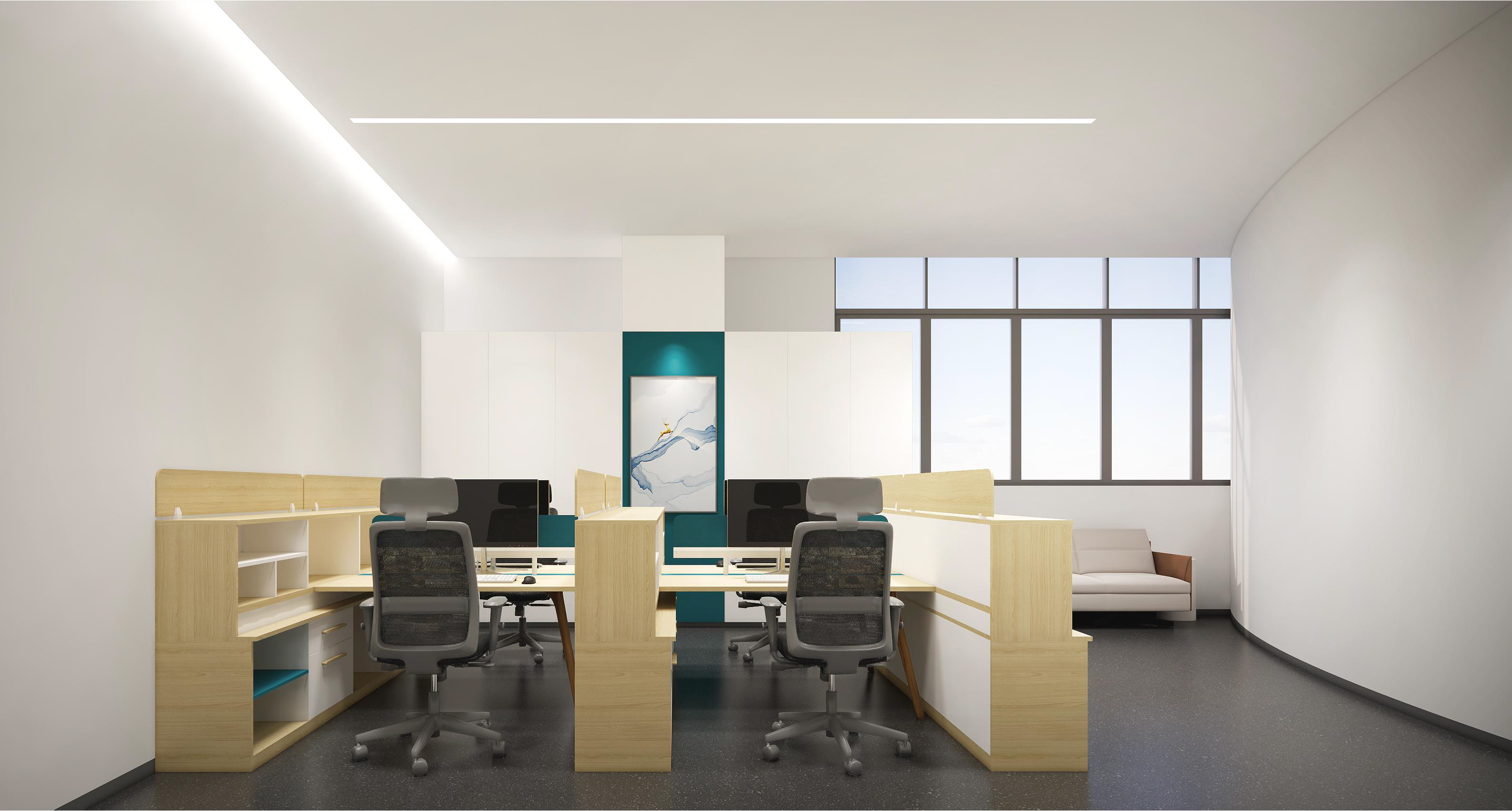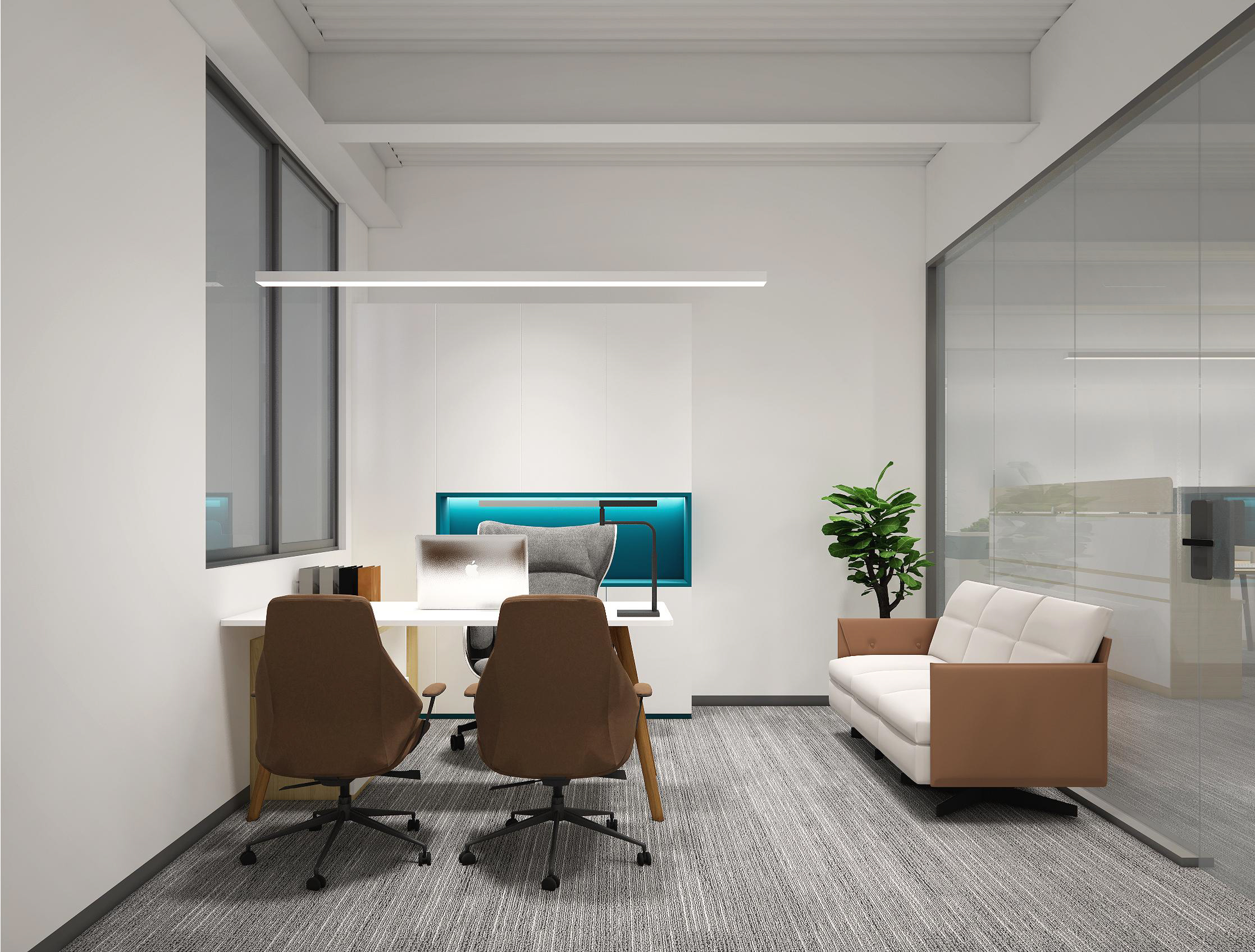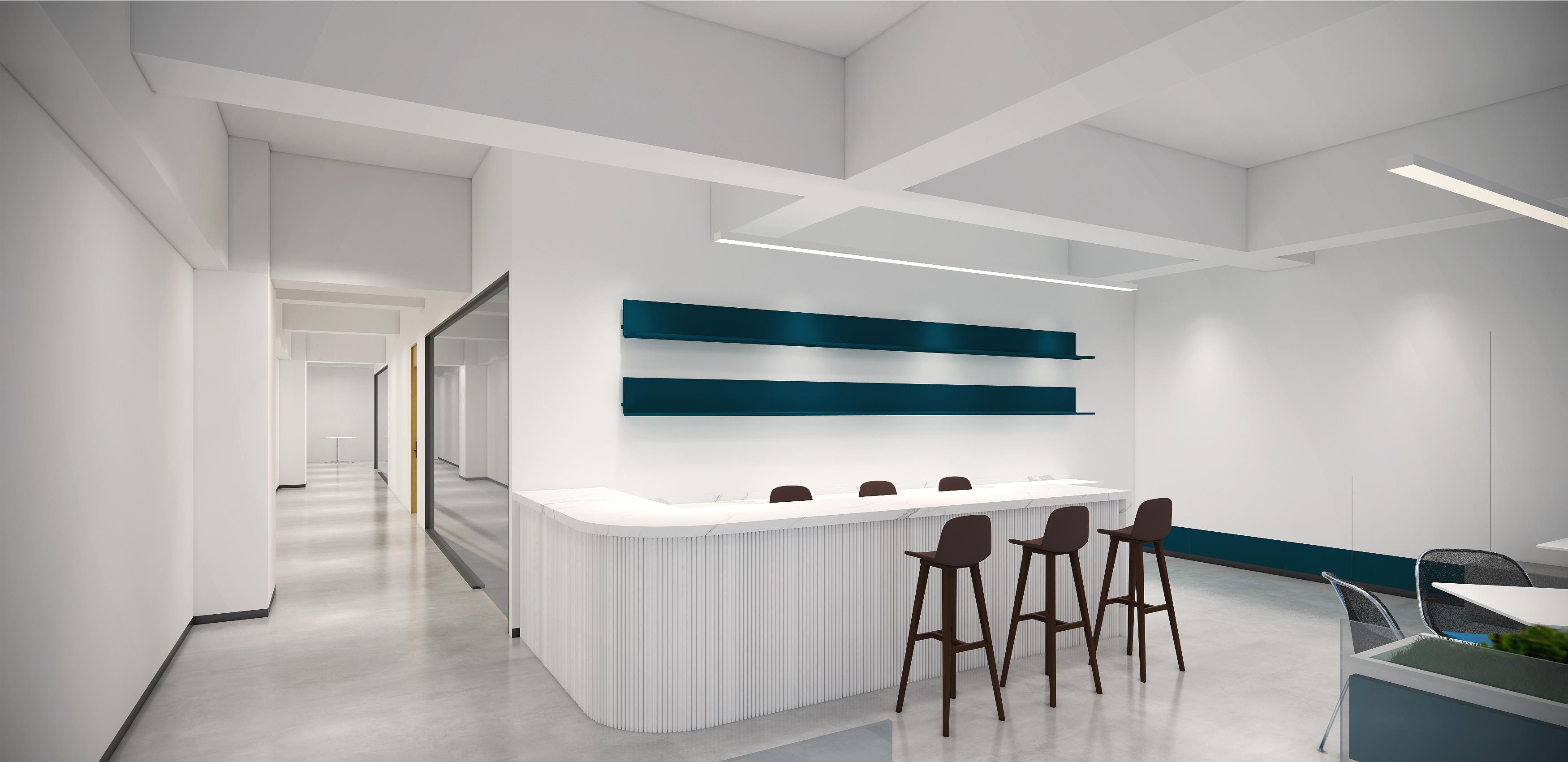 墻面幾何線條的使用,突出現(xiàn)代感,同時(shí)增加動(dòng)感。冷色調(diào)墻面強(qiáng)調(diào)科技感,開(kāi)放式布局,空間更加通透、流動(dòng)。