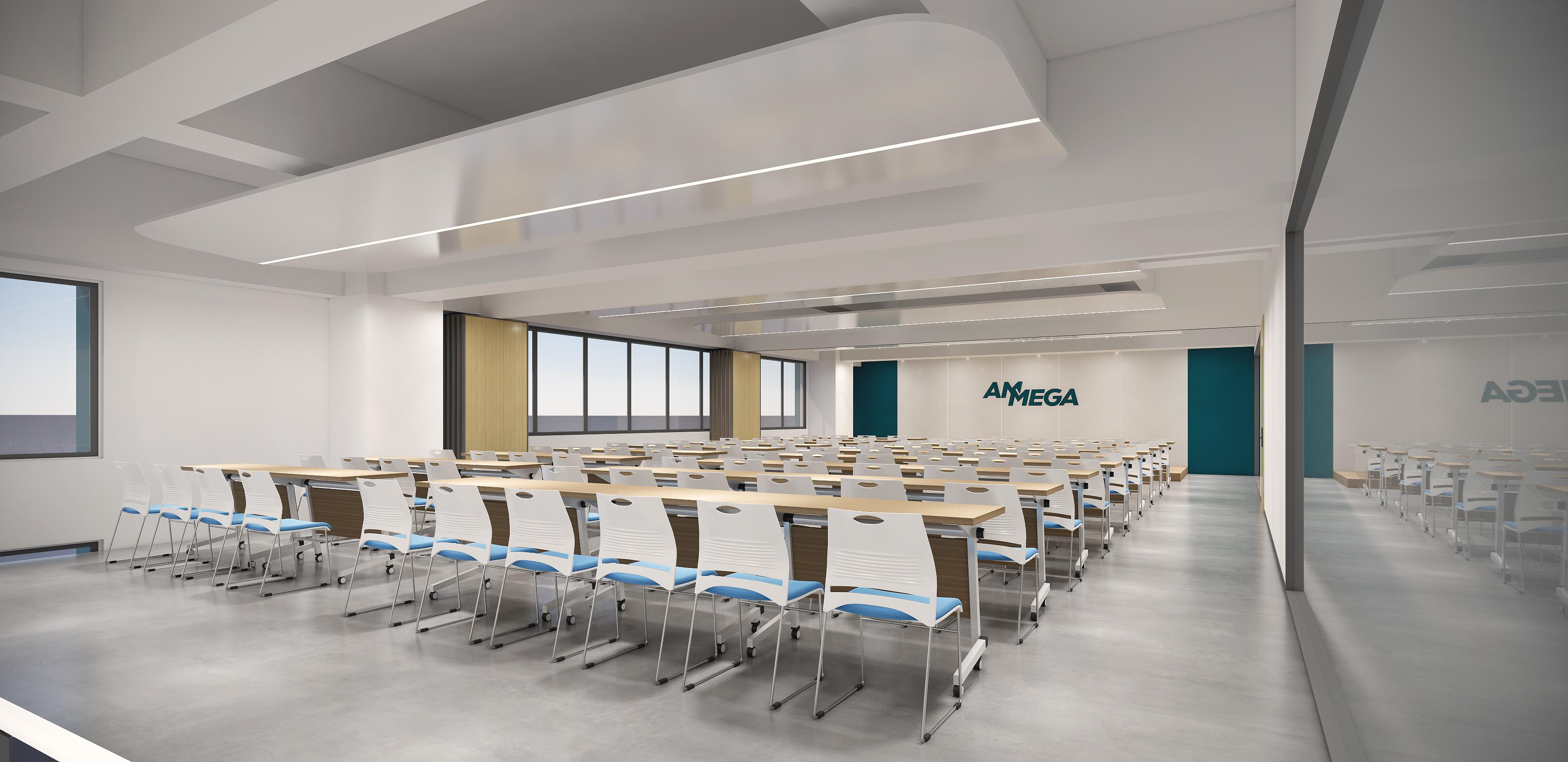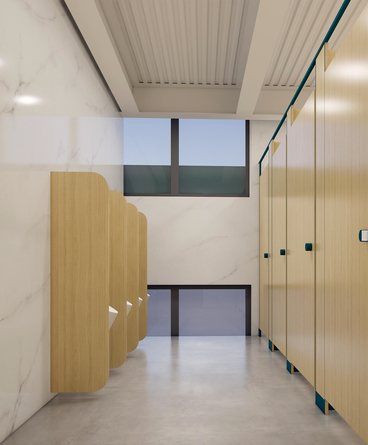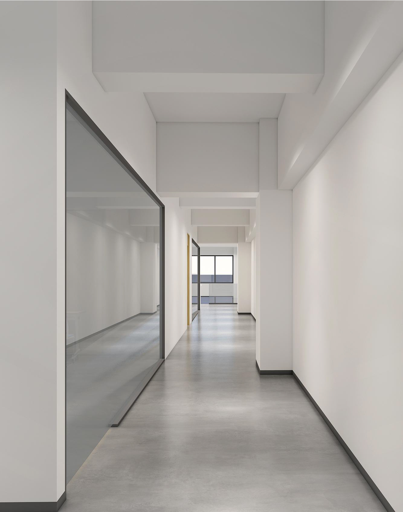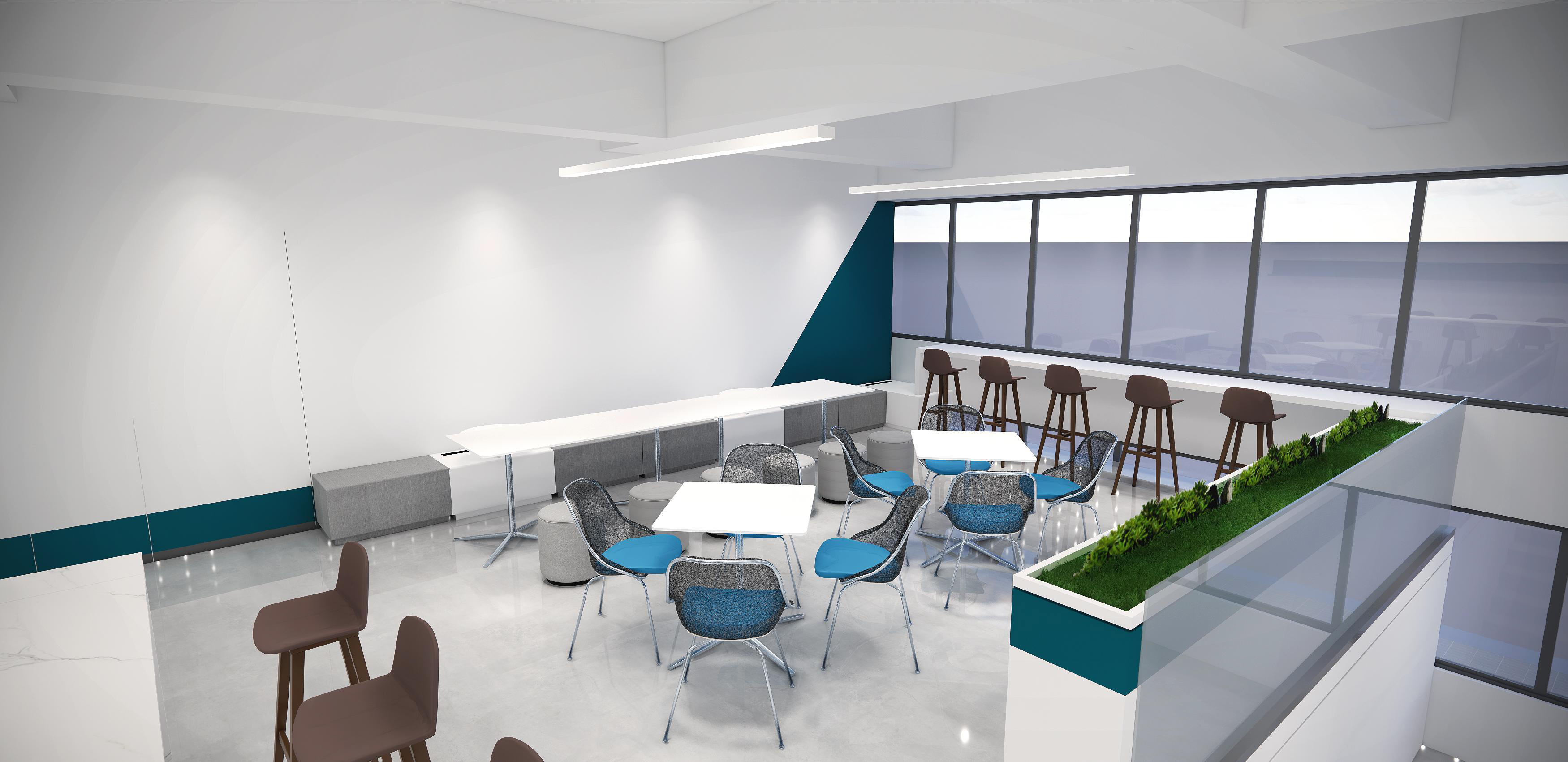 墻面幾何線條的使用,突出現(xiàn)代感,同時(shí)增加動(dòng)感。冷色調(diào)墻面強(qiáng)調(diào)科技感,開(kāi)放式布局,空間更加通透、流動(dòng)。