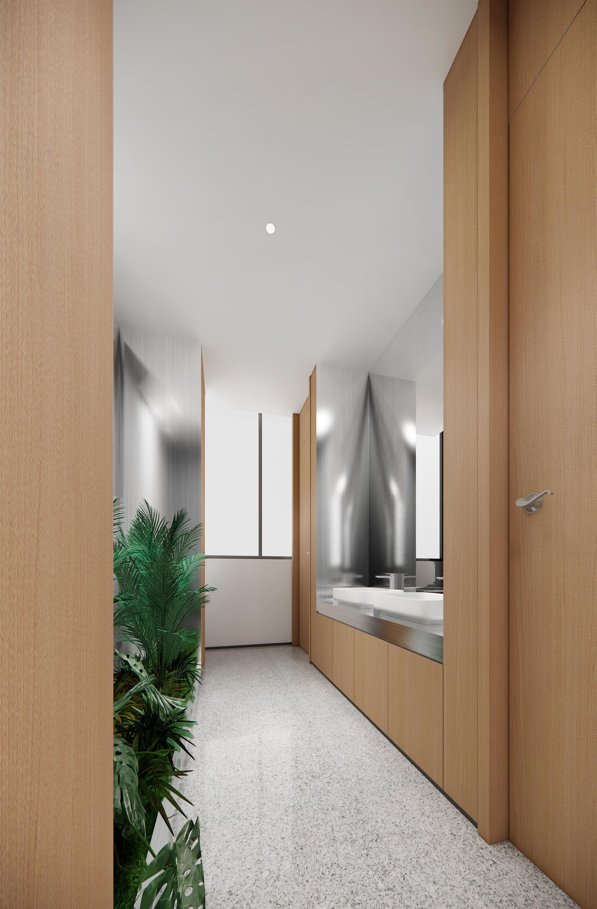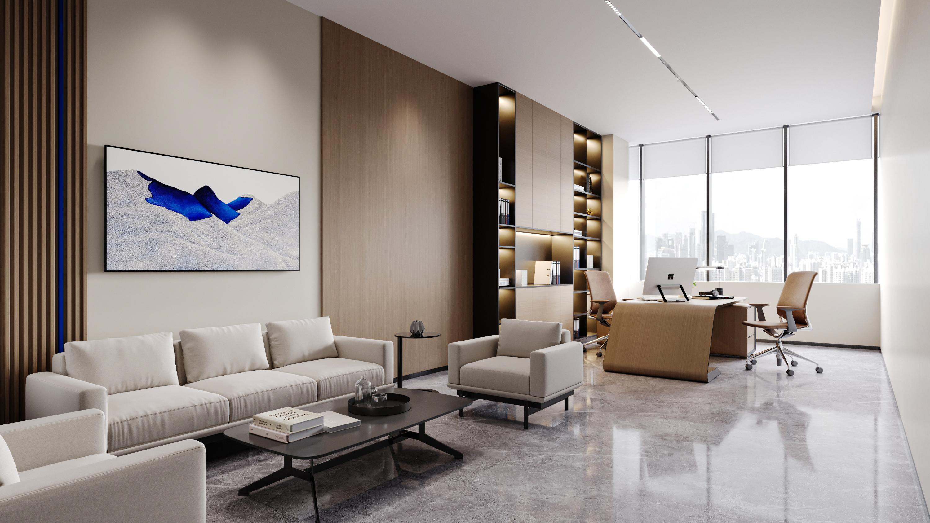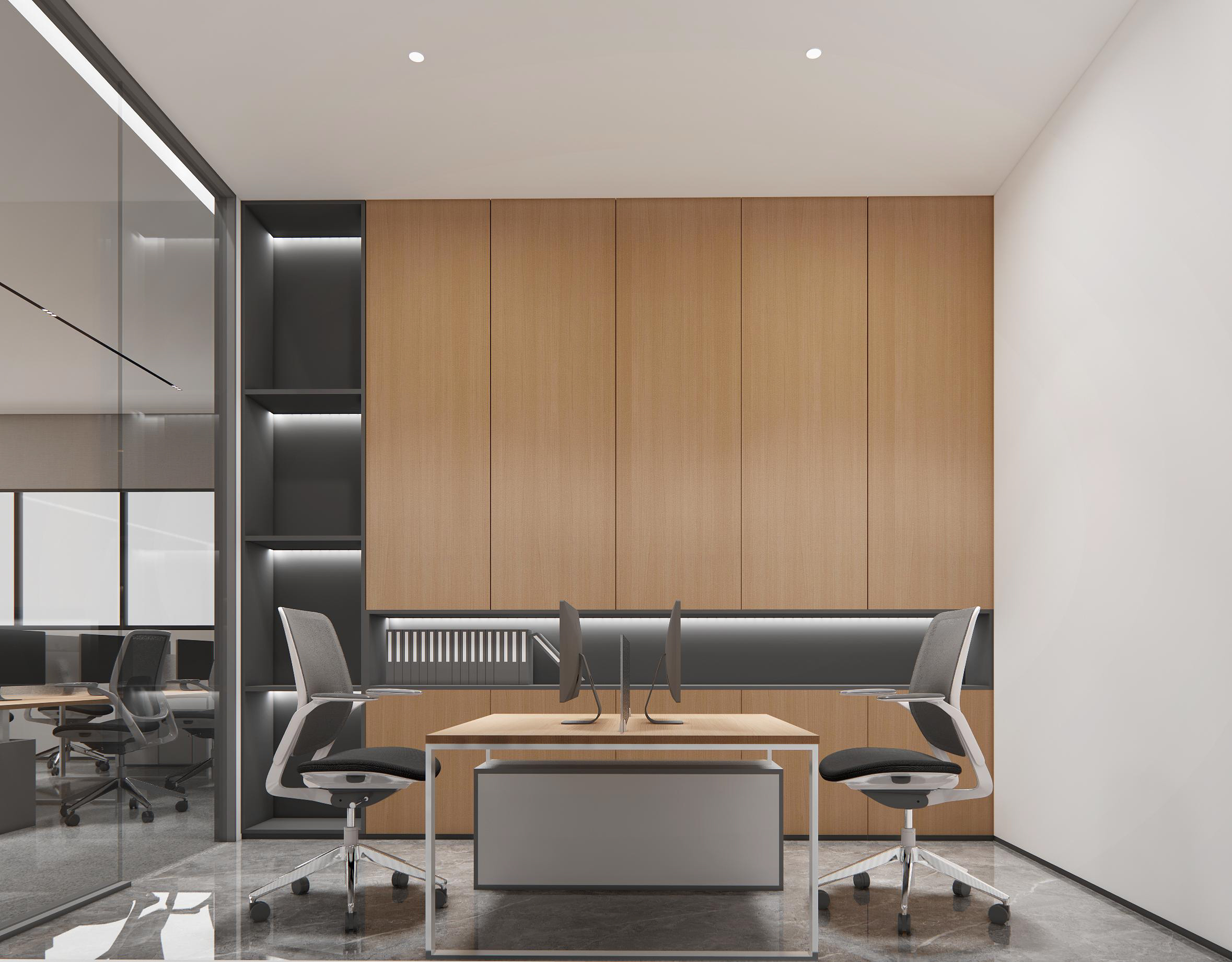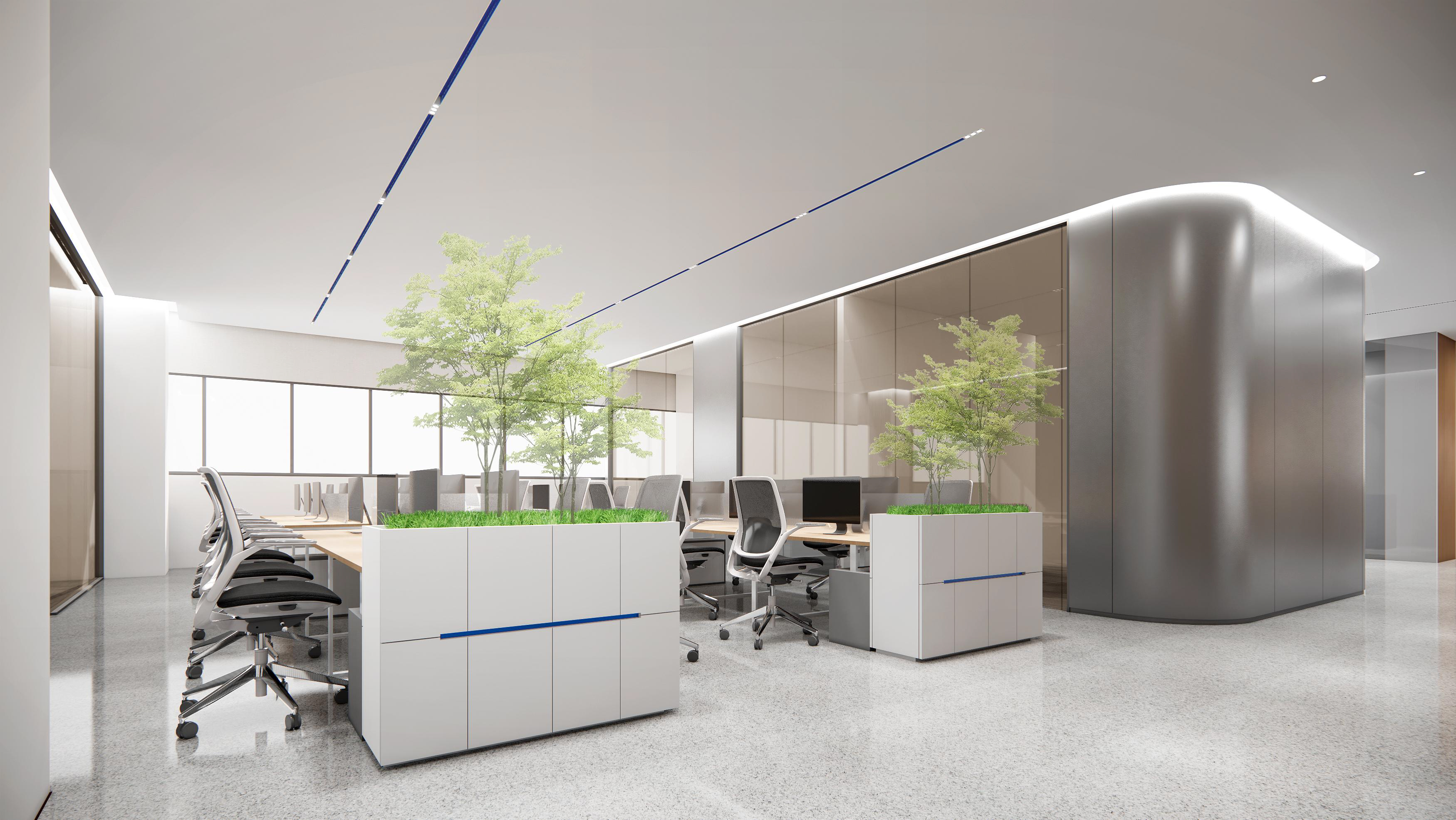 以冷色作為主色調,強調科技感。墻面使用金屬質感材料以及玻璃,反射光線,增加空間的通透感和現代感。開放式辦公室的設計,使空間更加開闊。