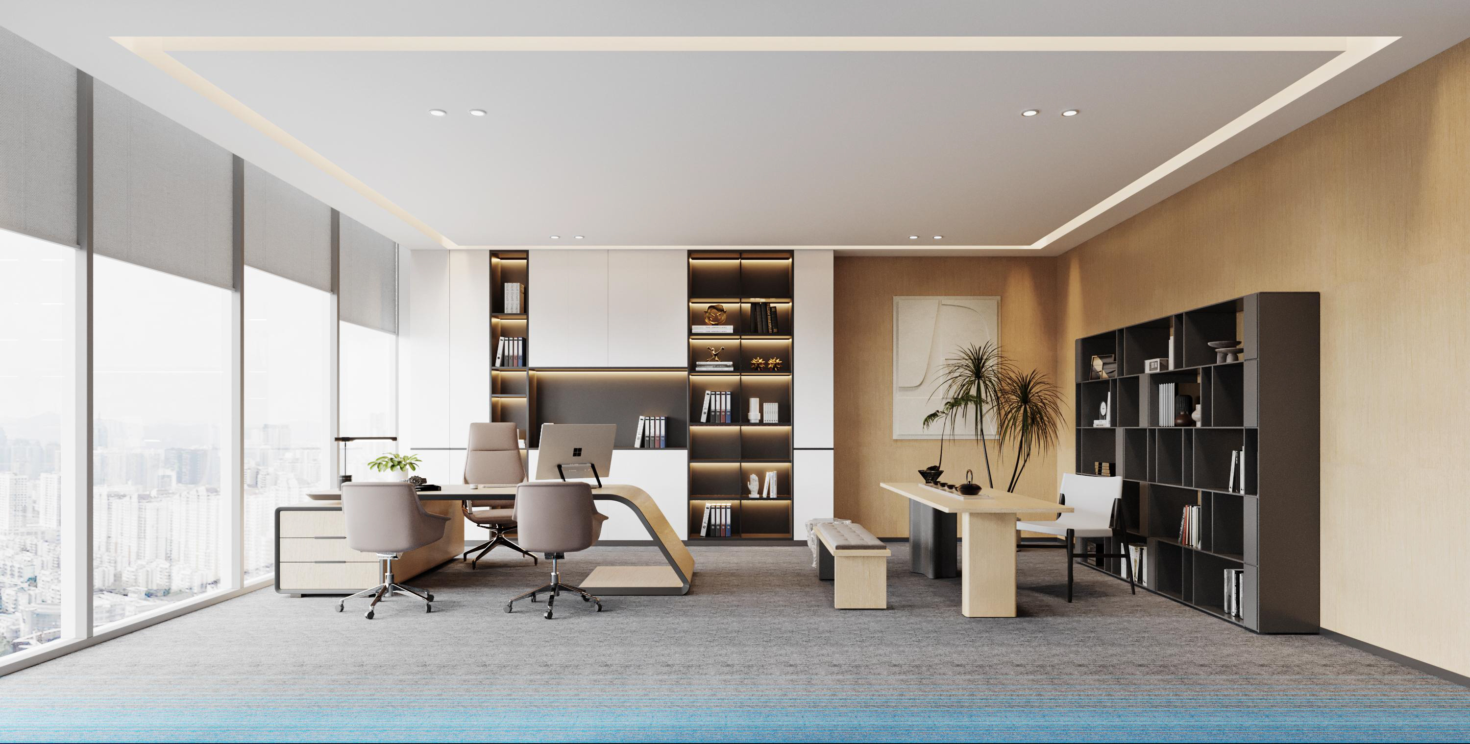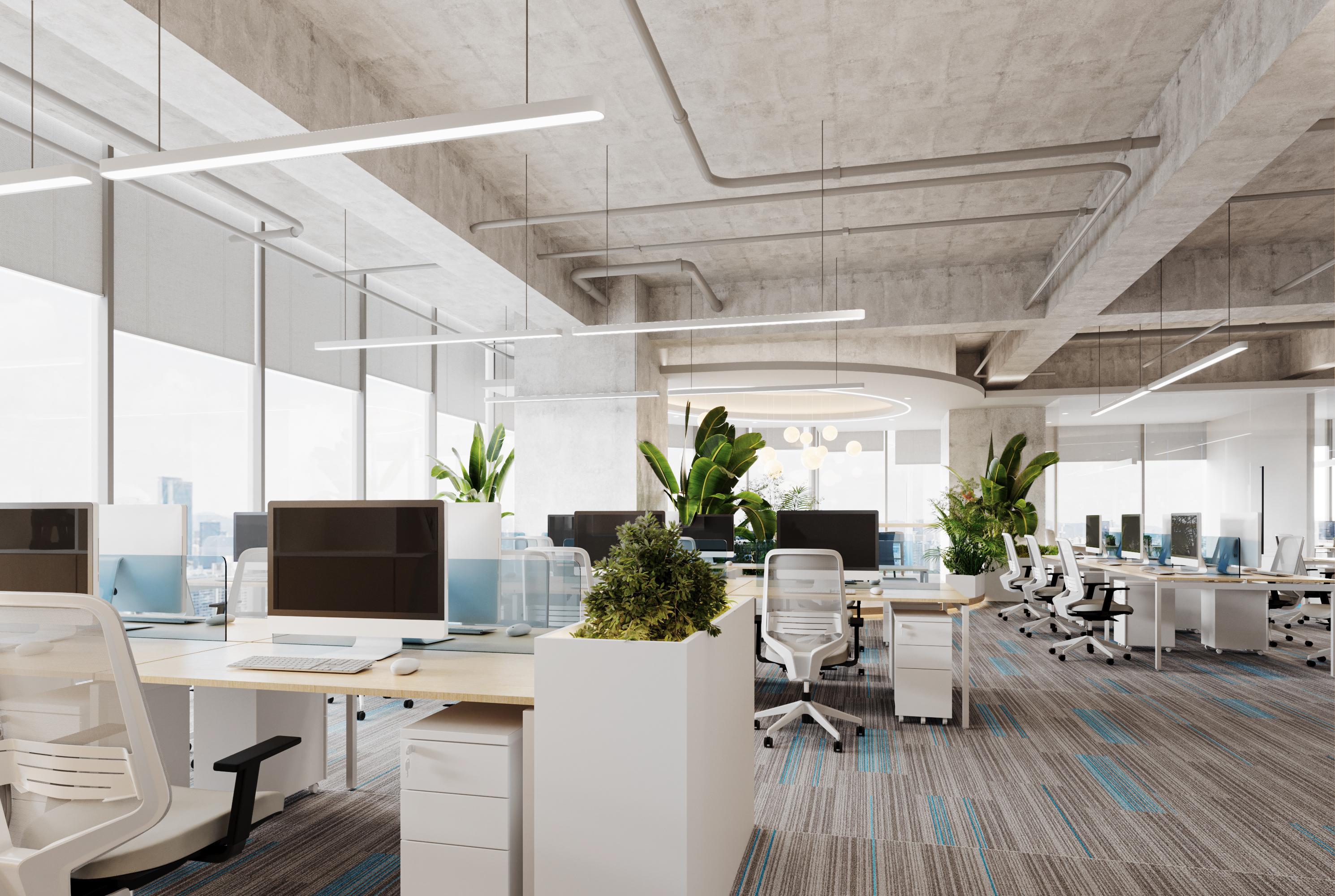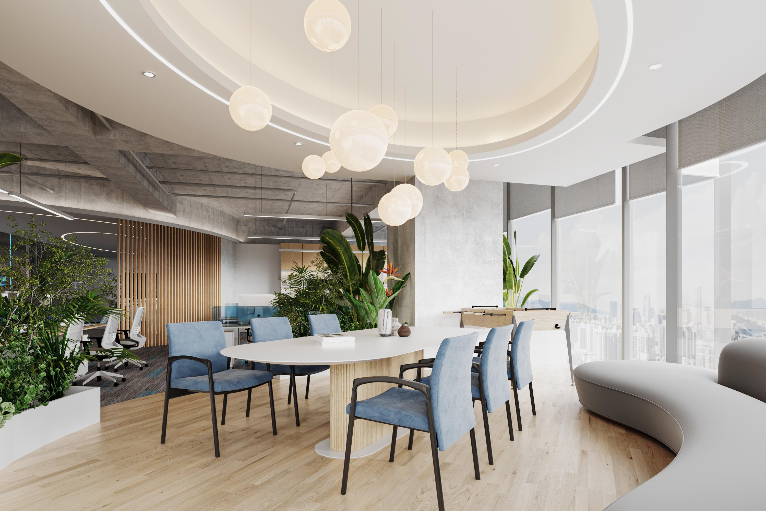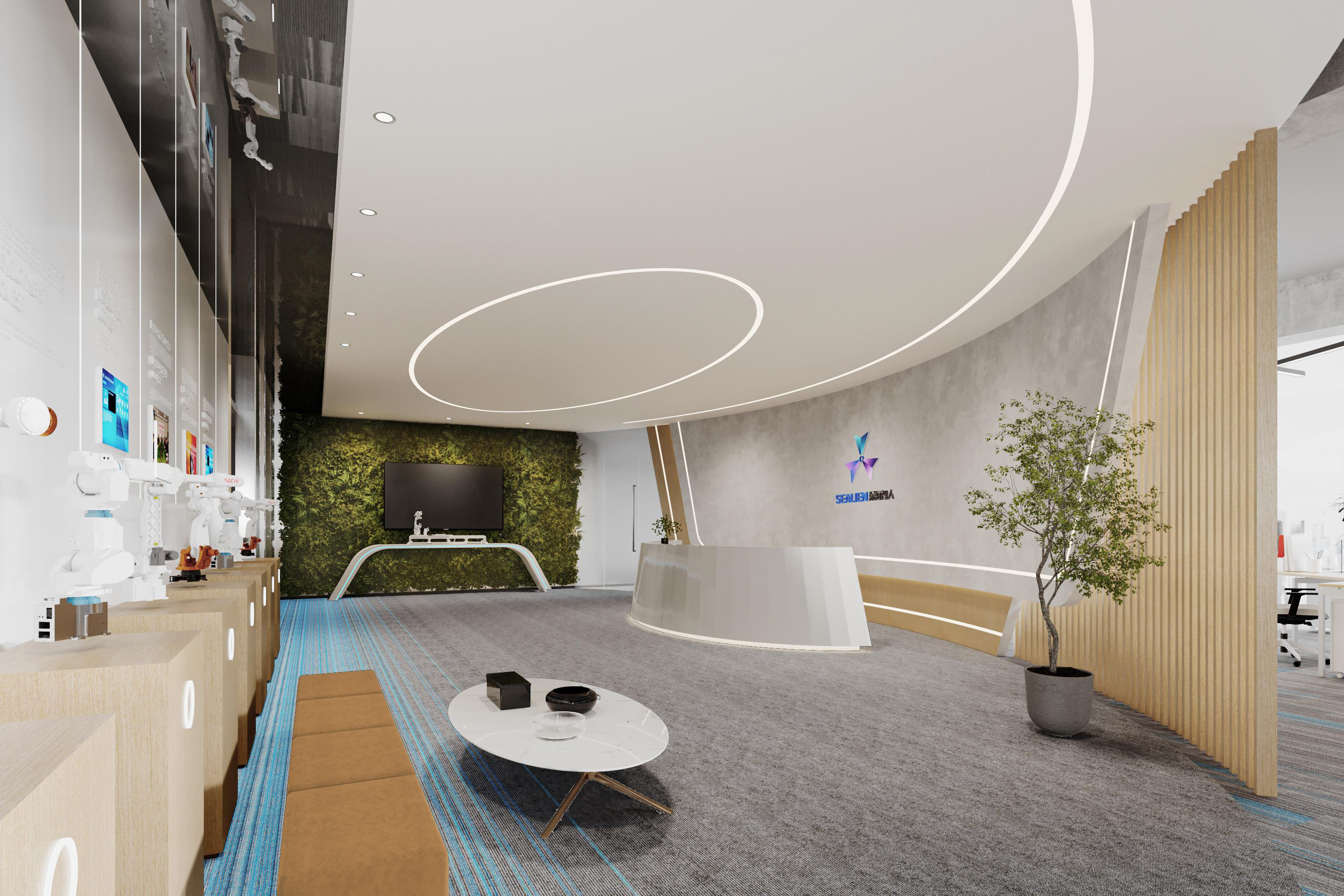 整體選擇以灰色作為主色調,營造簡約、現代的感覺,藍色條紋的設計強調了科技感。照明上使用led燈,根據不同的色溫營造氛圍。辦公空間采用開放式布局,減少隔斷,使空間更加開闊,綠植等元素為辦公空間增添自然色彩,帶來了生機。