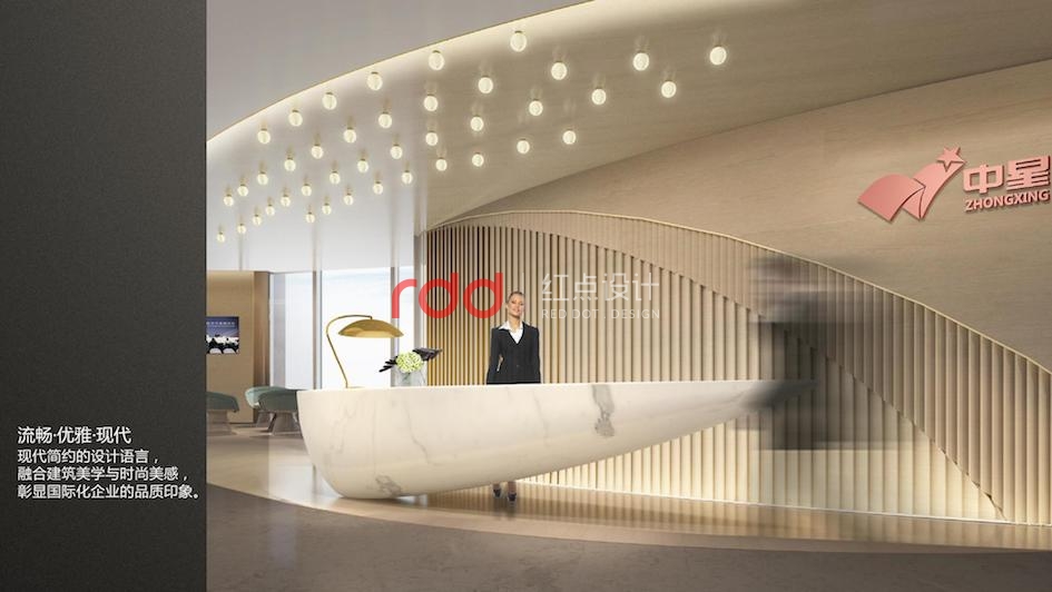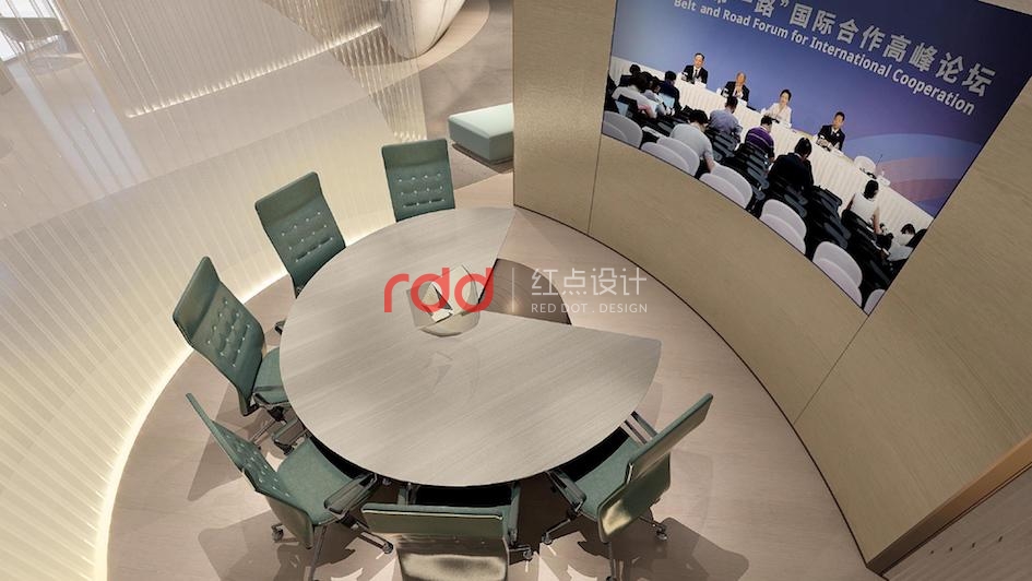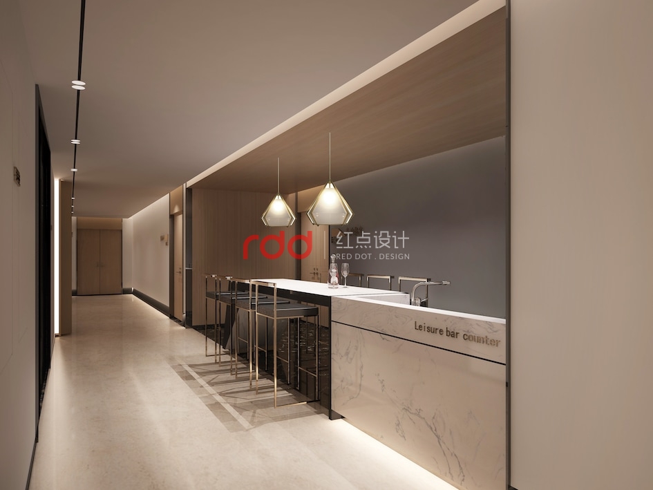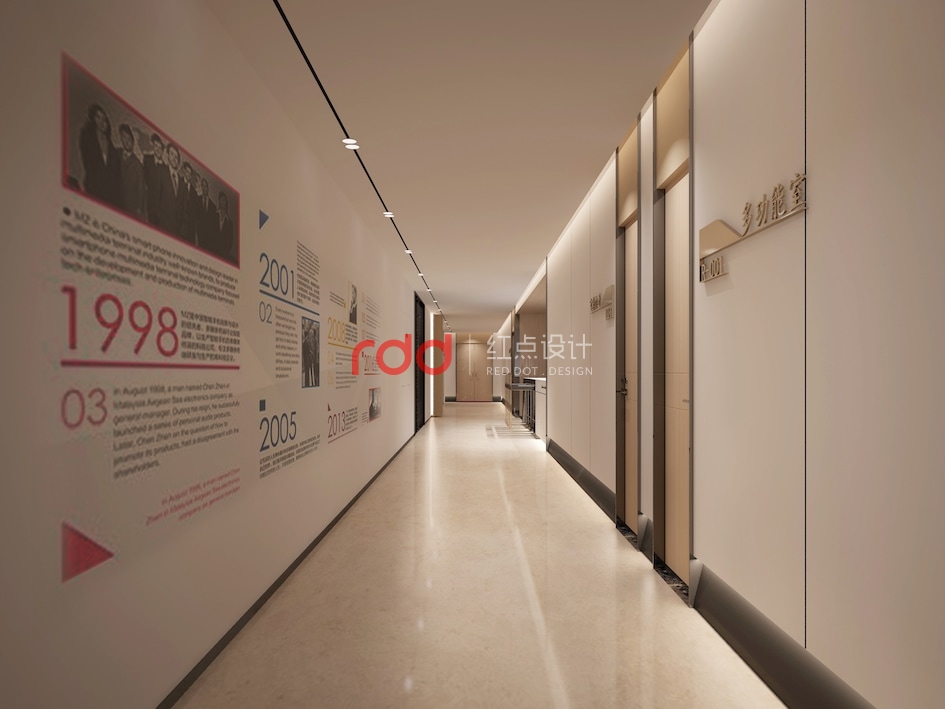 乘著徐徐而上的電梯來到九層,接待吧臺與整體空間講究對稱平衡,通過巧妙的吧臺構成形式、空間吊燈的位置,呈現靈動的立面關系,有效緩解空間的呆板。放眼望去,企業的發展歷程及榮譽的光輝背景盡收眼底,木飾面與白墻的過道簡單明了。