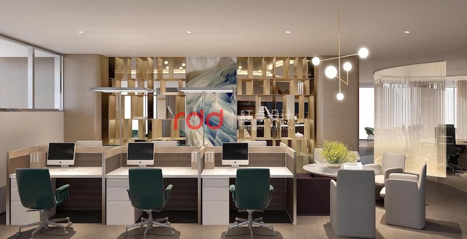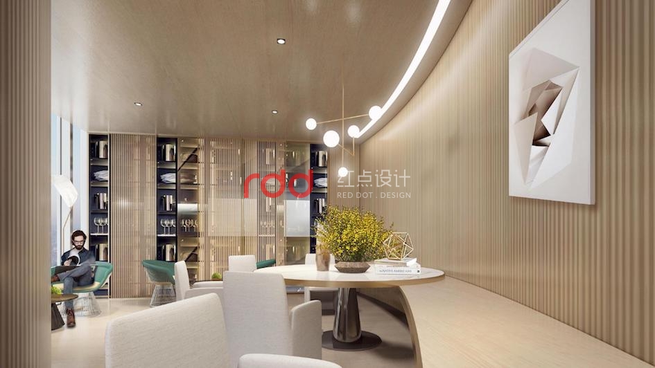 步入前臺區域,金屬與木飾面組合而成的弧形背景墻如水般靈動,白色大理石前臺宛若磐石般佇立在平靜的水面上,再加上墨綠色的皮質家具,柔和的空間多了幾分硬朗。沿著空間動線,來到休閑區,淺木色飾面從墻面造型延伸到天花,配上木質與金屬結合的家具,整個暖和的空間多了一絲涼爽。弧形的會議室玻璃隔斷使空間多了些許俏皮活潑。到頂的書柜作為空間的重要元素起到了隔而不斷的作用,員工在辦公之余又能汲取新的知識,正真意義上的寓學于工作,學習工作兩不誤。