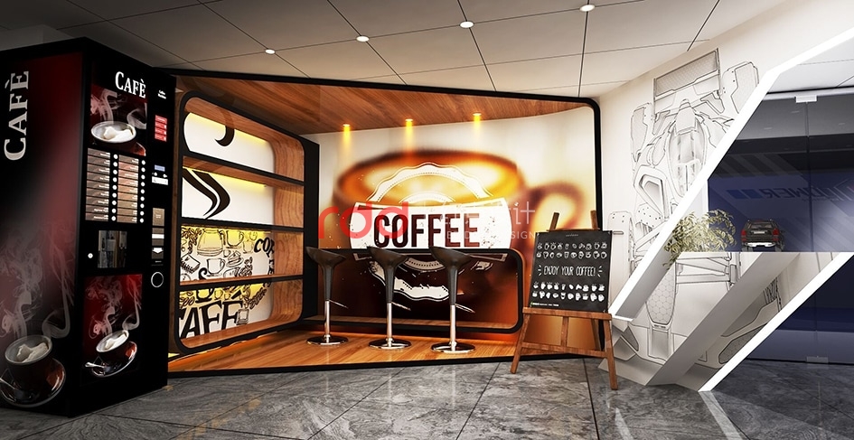 對于不同性質功能的空間,設計師以不同的主題場景為設計點,例如前臺區域以灰色為基調,通過深淺不一的灰色及線條硬朗的造型前臺,配上墻面賽車圖案,整個環境充斥著強烈的機械感及線條感。在咖啡的休閑區以咖啡為主題,原木飾面從地面一直延伸到天花,配上沉穩的黑色及咖啡圖案,做舊的黑板點餐牌,咖啡吧的感覺就活隱活現。