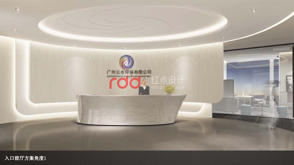 廣州美珊園林有限公司是云南水務下的子公司,是以“環保”行業為主的行業公司,為了突出該公司環保的理念,紅點裝飾的設計師在前廳立面背景及等候區的背景墻上采用弧形的結構,加上大理石的前臺,在平面上看猶如母親的雙手呵護的珍珠。天花上logo雕刻與背景墻上的logo形成呼應。