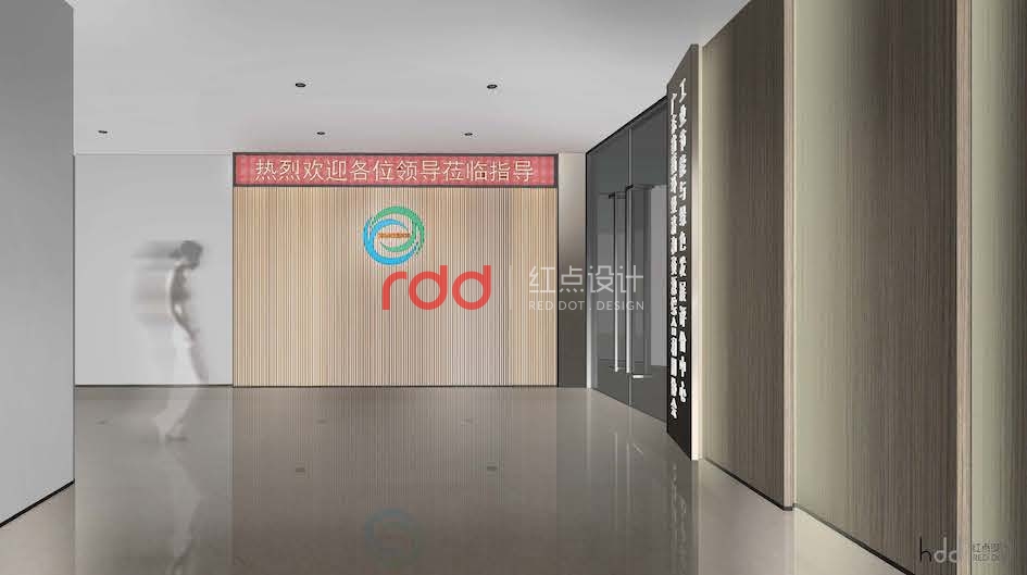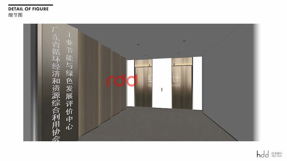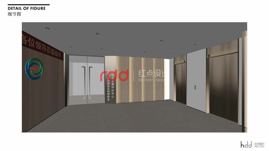 設(shè)計(jì)師利用“一空間多用的”的特點(diǎn),把電梯間作為該單位的形象宣傳區(qū)域。進(jìn)入電梯間,藍(lán)與綠雙環(huán)保型結(jié)構(gòu)的logo在再生木背景墻的映襯下突出醒目,靠近門的區(qū)域使用層層跌級(jí)結(jié)構(gòu),與環(huán)保型logo相呼應(yīng)。