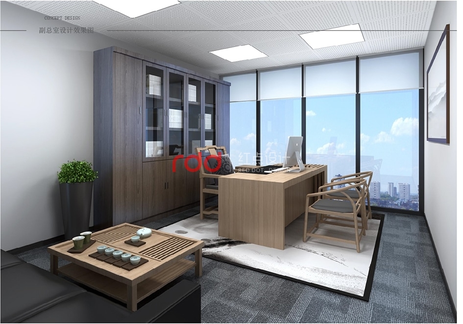 開放辦公區以白色和灰色為主調,加上紅色的辦公家具為點綴,總經理辦公室及會議室均以木色為主調,配合暖木色的家具,簡單大方而不失穩重。