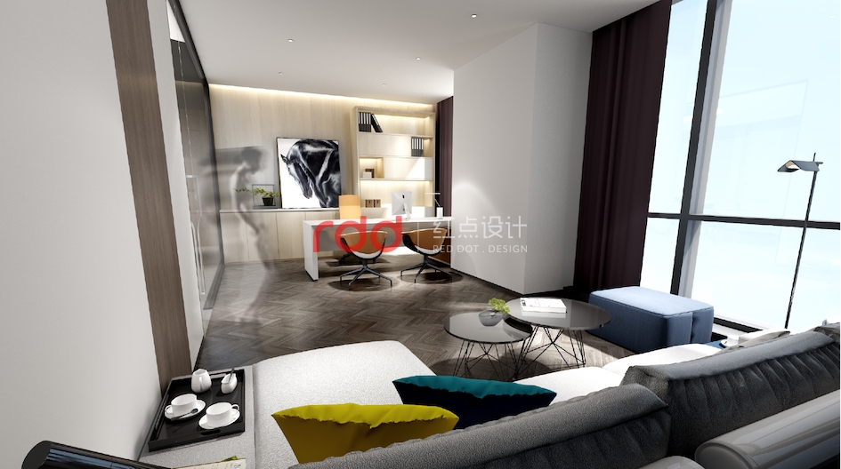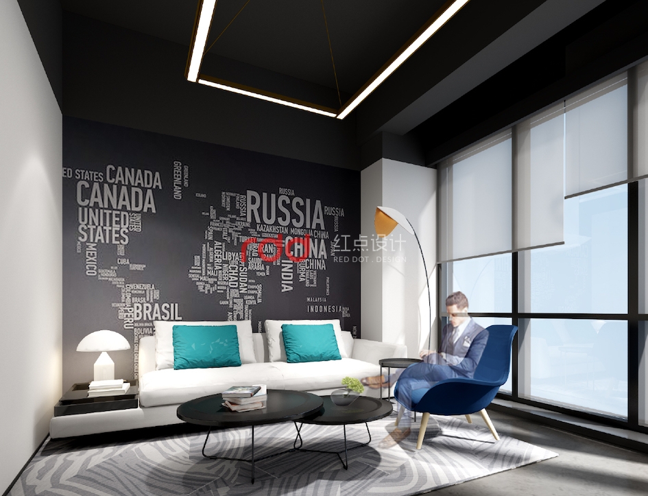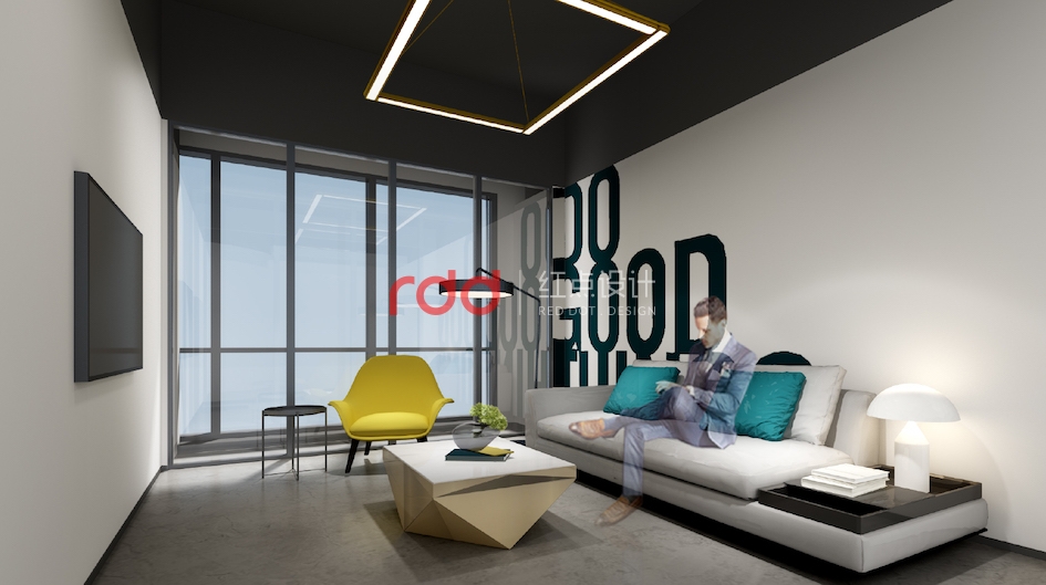 本案紅點裝飾的設計師根據該公司的名稱,利用火的形狀的抽象線條劃分整個辦公空間。前廳弧形背景墻一直延伸到休閑區,與天花造型結合,把火具象化。