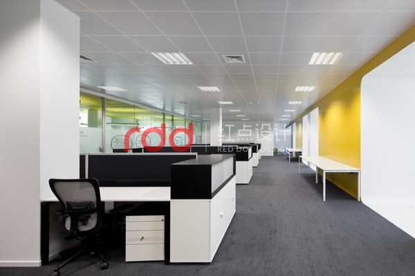 IT行業(yè)給人的印象是硬朗的,為了打破這樣的固定思維模式,紅點裝飾的設(shè)計師運用黃色及紫色比較柔和的色彩來改變空間的氛圍。線條交錯的白色鏤空隔斷圍合,形成相對獨立的空間。