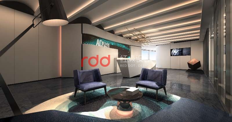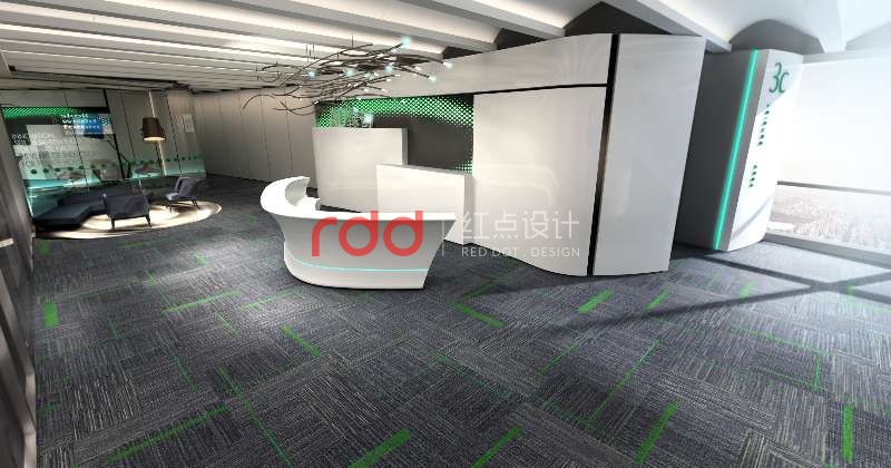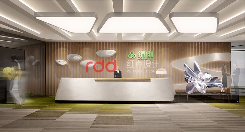 黑白灰是永恒不變的主題,加上綠創公司的LOGO色(綠色)為點綴色。本案紅點裝飾的設計師運用構成主義的手法,前臺背景利用正方體為基本元素,把不同大小的正方體組合在一起,中間利用穿孔鋁板噴成白色和綠色。地面鋪深灰色仿大理石磚,配上白色與灰色相間的造型前臺,整個空間看起來沉穩大方。