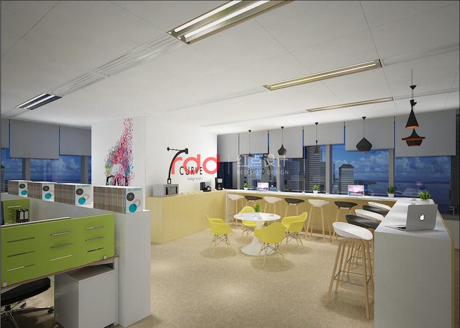 “起秀”有后起之秀之意,這是一個充滿新鮮血液和新生年輕力量的公司。在簡約設計風格的同時,紅點裝飾的設計師運用相對活躍的顏色,藍色、黃色、粉色、綠色,這樣的顏色既年輕又能帶動環境的氛圍,墻面上五彩的圖案既能降低造價成本,又能出效果,可謂一舉兩得。
