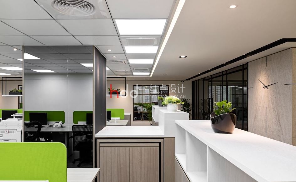 柜臺區,利用懸挑量體搭配間接光源,透過塊面的合宜配置,佐以娟秀細致的公司Logo,營造有如古樸字畫般的簡約場景,并于天花架構格柵線條,于窗旁規劃等候臥榻,增添了入門時的休憩感受;進入開放式員工辦公領域,則逐漸轉以躍動氣息,運用醒目而趣味的蘋果綠色調,巧妙呼應空間內的植栽布置,凝聚生動的工作氣氛,且給予陣列有序的座位分劃,鋪設出場域的層次之美;