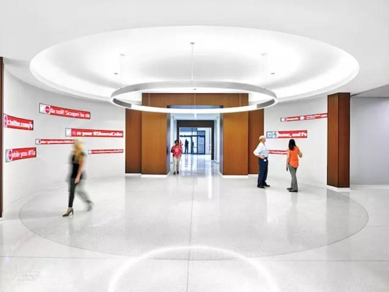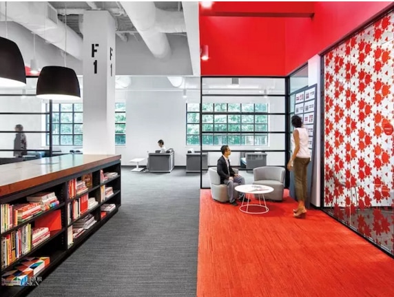 辦公空間如何凸顯企業(yè)文化也是設計中重要的一環(huán)。Gensler 的做法是,在園區(qū)的裝飾中添加品牌元素,諸如,用 55000 個光盤做了一面 logo 墻,委托設計師定制的經(jīng)典可樂瓶輪廓的乙烯墻面,以及圖書室、咖啡廳里隨處可見的紅白色元素,無一不在宣揚可口可樂的品牌形象。