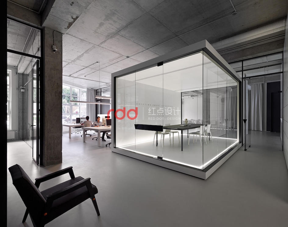 本例辦公室設(shè)計主要以空白紙張為概念。一張空白紙張,它可以轉(zhuǎn)化為一切:一幅畫,一本好書的頁面,或成為一個全新的東西。辦公室設(shè)計的中心是白色的立方會議室——兩個區(qū)域之間的通道。有一個封閉的外殼,以提供隔音。工作場所被區(qū)分為兩個白色的大島嶼,布局格外舒適。