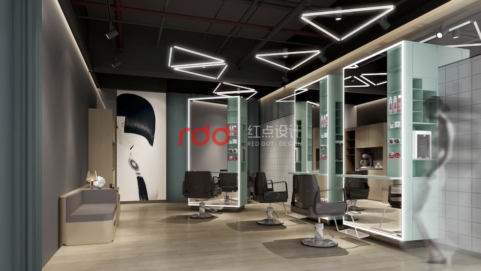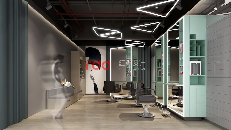 “快剪”是口紅經濟時代下的快時尚、簡文化。喜剪工坊理發店正是這種干凈環保理發模式,這個時代趨勢的產物。據Pantone發布今年的年度流行色是綠色。因此紅點裝飾設計的設計師運用馬卡龍綠為整個空間的主色調,這種顏色既符合流行趨勢也給進去剪發的顧客一種清新的感受。正符合喜剪工坊:互聯網、輕時尚、用心剪的服務理念。
